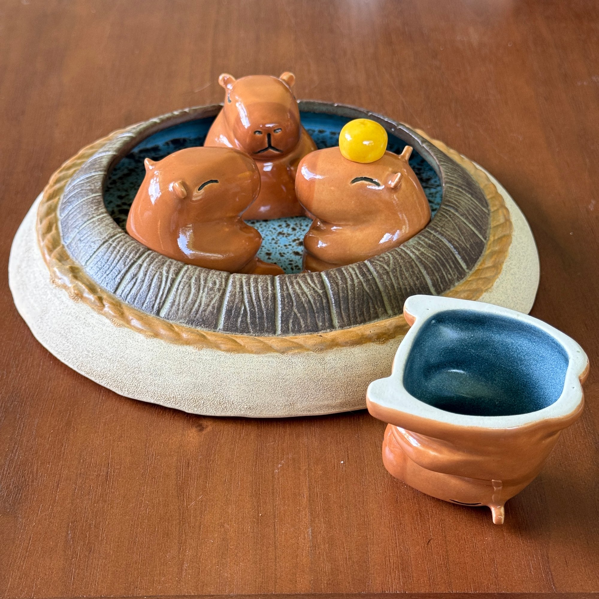 This limited edition set features four Capybara Sippers—each one lounging in their own serene soak, complete with removable towel and yuzu accessories to rest on their heads when not in use. They’re served in a carved "Onsen" bowl with sculpted rope detailing and aged hinoki-style planks, designed to evoke a peaceful hot spring retreat.